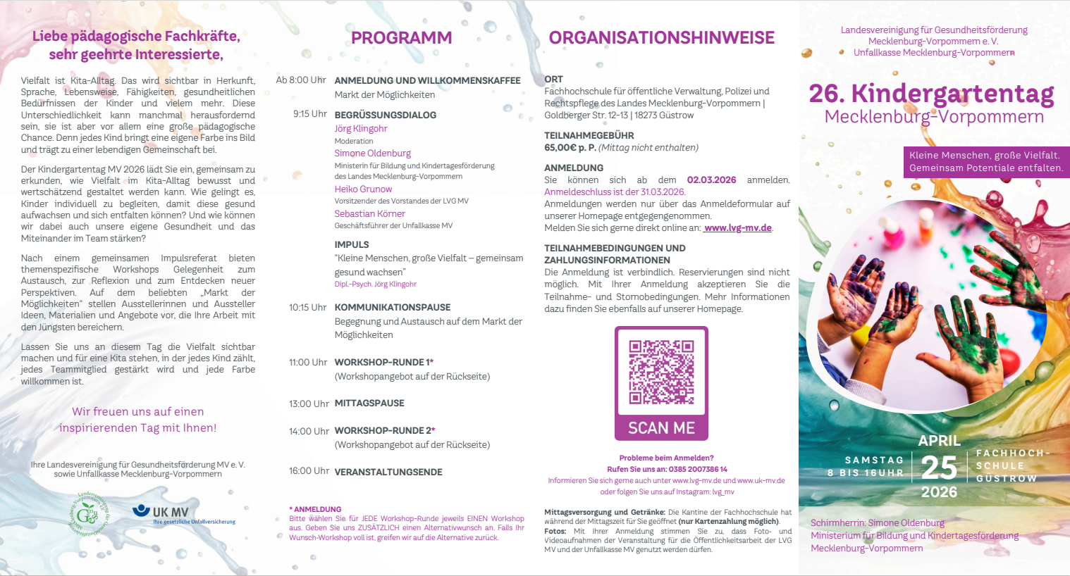Den direkten Zugang zum Anmeldeformular und weitere Informationen finden Sie hier: Kindergartentag Mecklenburg-Vorpommern | Gesundheitsförderung Mecklenburg-Vorpommern e. V.
