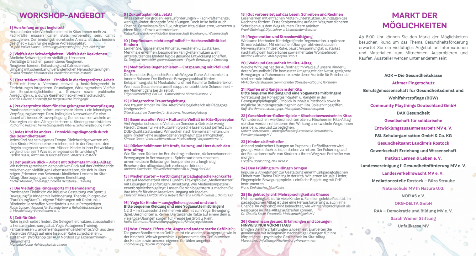 Die Veranstaltung richtet sich an pädagogische Fachkräfte, Kita-Leitungen und Träger und ist geprägt von interessanten Vorträgen und vielfältigen Workshops. Im Fokus stehen Vielfalt im Kita-Alltag, chancengerechte Bildung und Gesundheitsförderung.