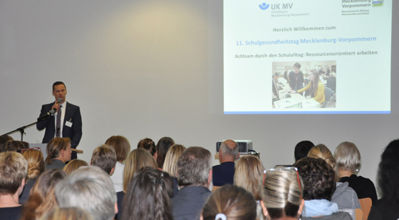 Im Warnemünder Technologiepark fand am 18. Oktober 2018 der 11. Schulgesundheitstag MV statt. Mehr als 130 Teilnehmerinnen und Teilnehmer bildeten sich bei Vorträgen, Praxistipps und Übungen unter dem Motto "Achtsam durch den Schulalltag: ressourcenorientiert arbeiten" fort. Einen Schwerpunkt bildete der gegenseitige Austausch zwischen den Teilnehmerinnen und Teilnehmern. Organisiert wurde der Schulgesundheitstag vom Institut für Qualitätsentwicklung MV und der Unfallkasse MV.